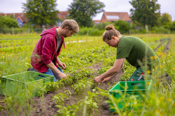 Wir streben eine abwechslungsreiche Ernte mit über 40 Kulturen im Laufe des Jahres an – je nach Jahreszeit. In den Monaten Juli bis Dezember ist die Haupterntezeit. Dann gibt es die größte Gemüsevielfalt. Im Frühjahr sind die Mengen geringer, da das Gemüse noch wachsen muss und die Kapazitäten in den Gewächshäusern begrenzt sind. Im Winter gibt es Feldsalat, Porree, Rosenkohl oder Grünkohl sowie haltbares Lagergemüse wie Kartoffeln, Möhren oder Zwiebeln.